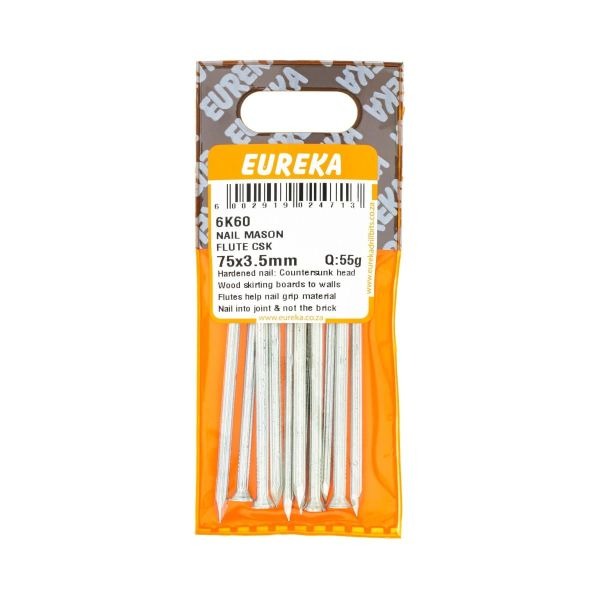 R16.34 inc. Vat Nail Mason Flute Csk 75X3.5Mm Q:55G 4 in stock Nail Mason Flute Csk 75X3.5Mm Q:55G quantity Add to cart SKU: EUR-6K60 Categories: Bolts Nuts Screws & Anchors, Consumables, Electrical, Tools